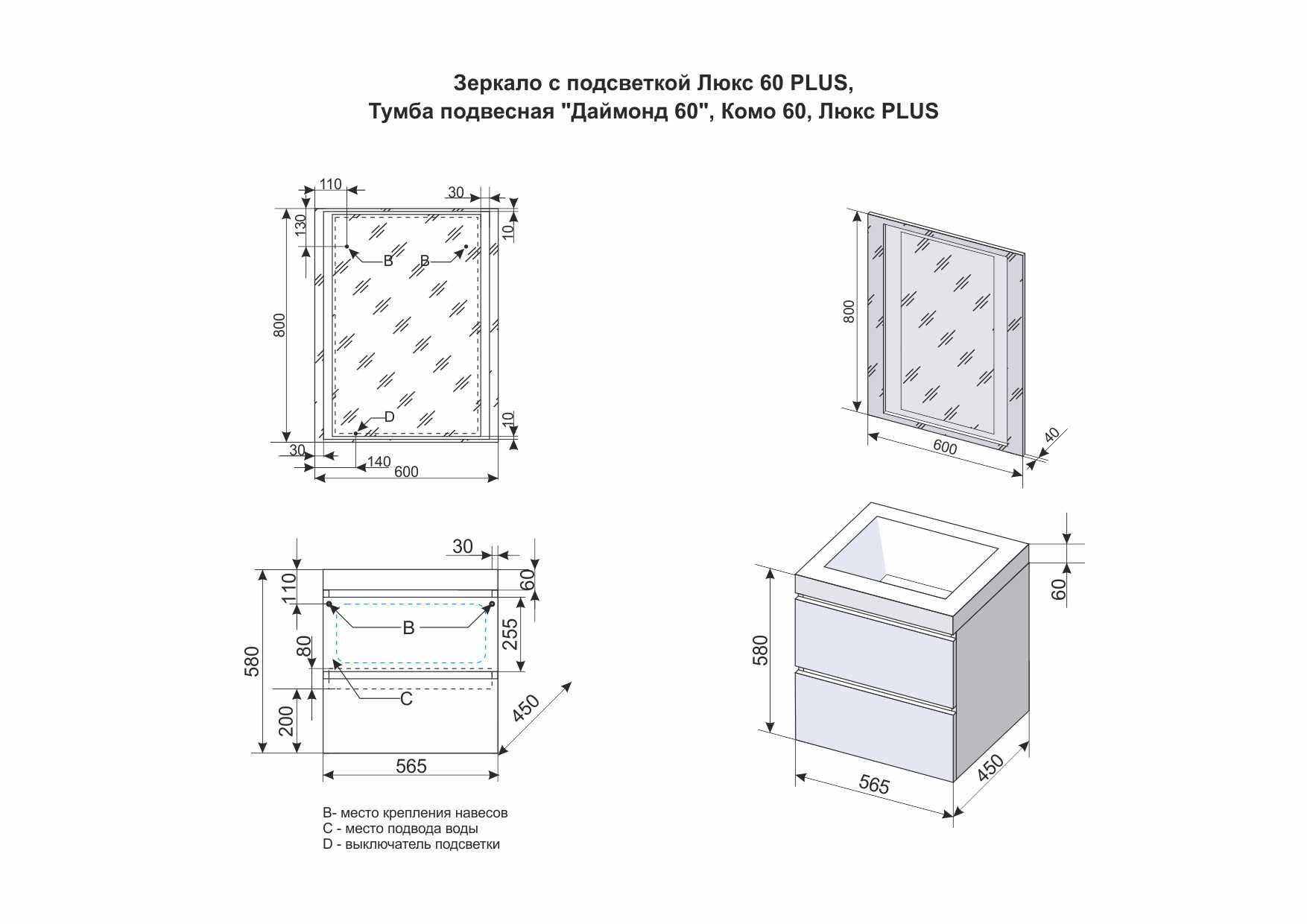 Тумба для комплекта Style Line Даймонд 60 Люкс Plus подвесная, белая |